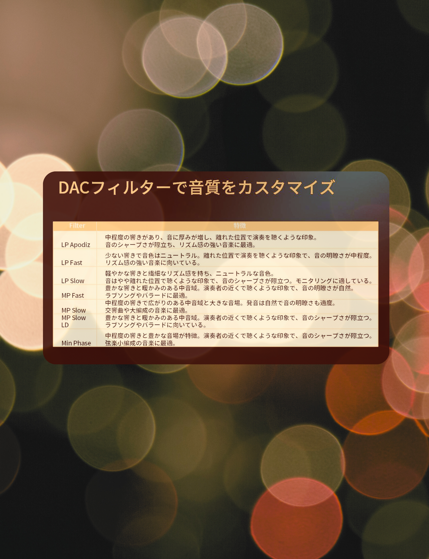N2はDACにESS ES9039PROを採用しています。ULAと最適化したフィルターにより好みの音色変化を7つ楽しむことができます。