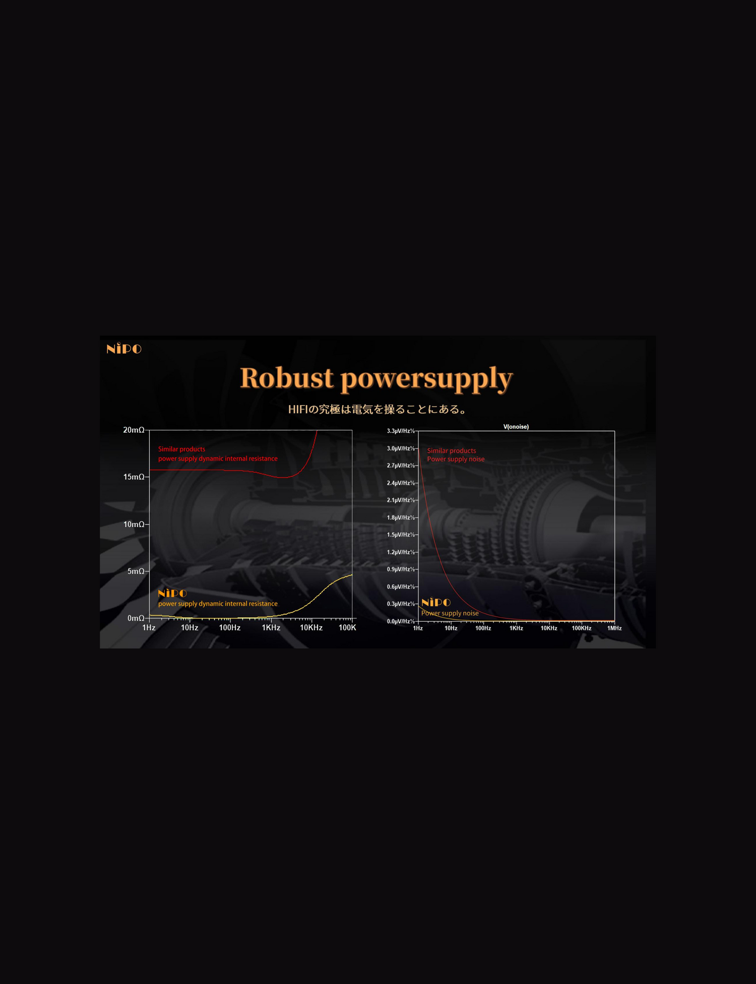 電源ノイズ対策と動的内部抵抗の最適化によって、音質の基盤となる電源供給の品質を徹底的に向上させました。高いリニアリティ、低ノイズ、低インピーダンスを備えた電源設計に加え、多段フィルタリング構造を採用することで、電源リップルやノイズ干渉を1Hzから100kHzの広い周波数帯域で効果的に抑制しています。さらに、電源のインピーダンスを動的に最適化する技術を搭載し、独自のリモートフィードバック技術により負荷状況をリアルタイムで監視。これに基づいて電源の応答速度を調整します。この設計により、電源経路での損失や相互変調歪みを大幅に低減し、瞬間的な大音量や鋭いアタックのあるサウンドも余裕を持って再現可能になります。力強い低音から繊細で滑らかな高音まで、あらゆる帯域で安定した音楽表現を実現し、細部まで鮮明に再現。音のディテールが鮮明に再現され立体感を際立たせます。