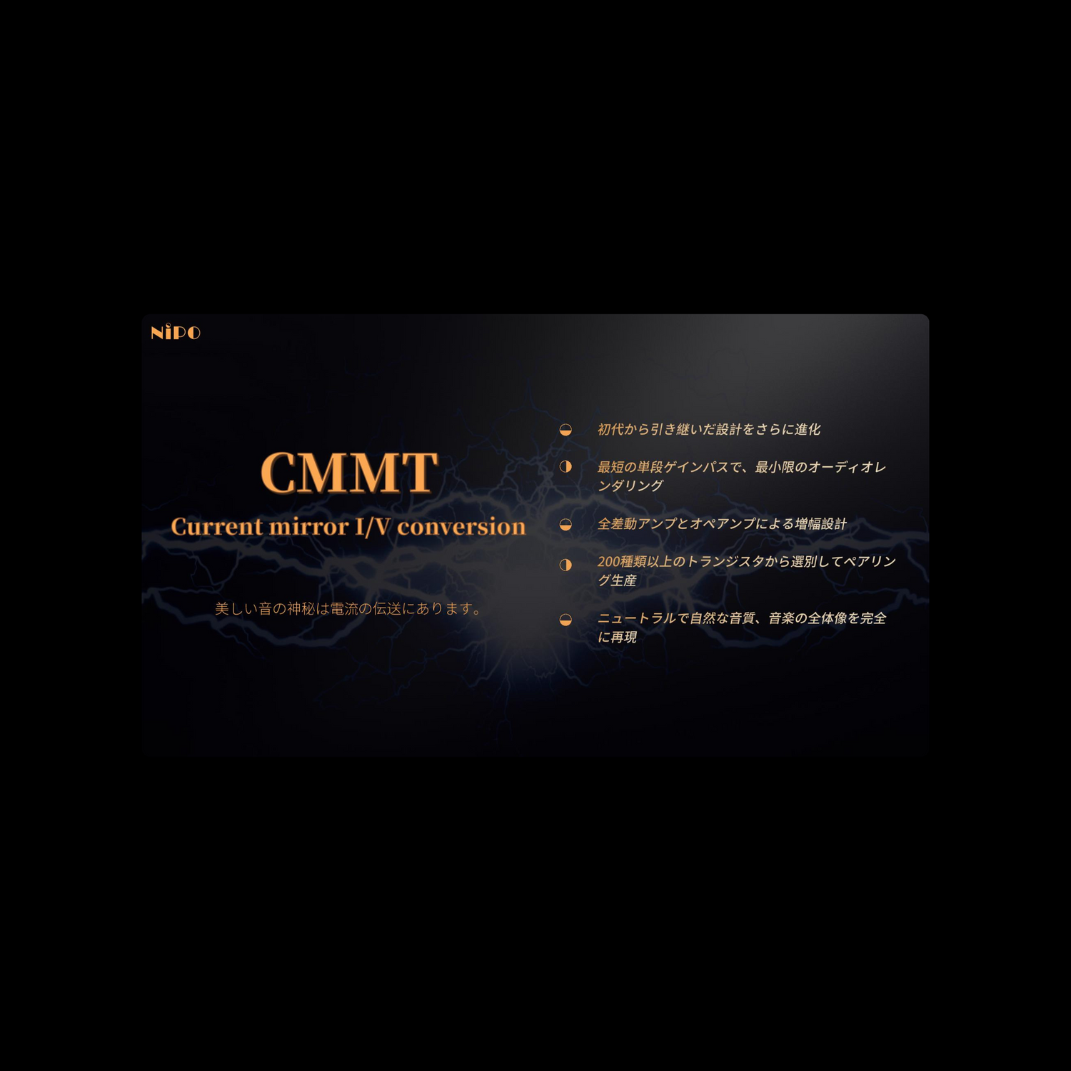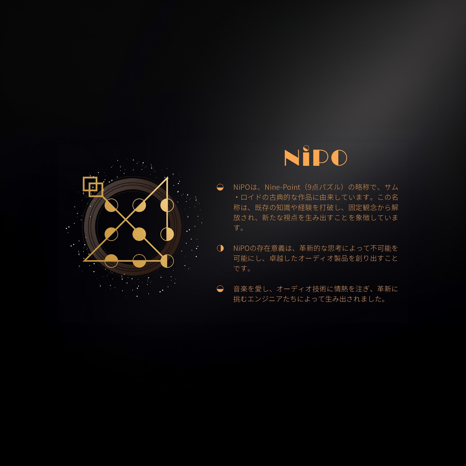 ブランド名のNiPOは、古典パズルの「Nine-dot Puzzle」の9つの点(Nine Point)に由来しており、固定観念にとらわれない革新的な発想と設計哲学を象徴しています。「Return to music's original nature(音楽本来の姿に立ち返る)」をコンセプトに、音の色付けを可能な限り抑え、音の原型を維持した上で、聴き疲れしない音質や鑑賞性を高めることを目指しています。代表作であるフラッグシップ音楽プレイヤーN2はアジア各国並びに、CAIA審査団からも高い評価を得ました。
