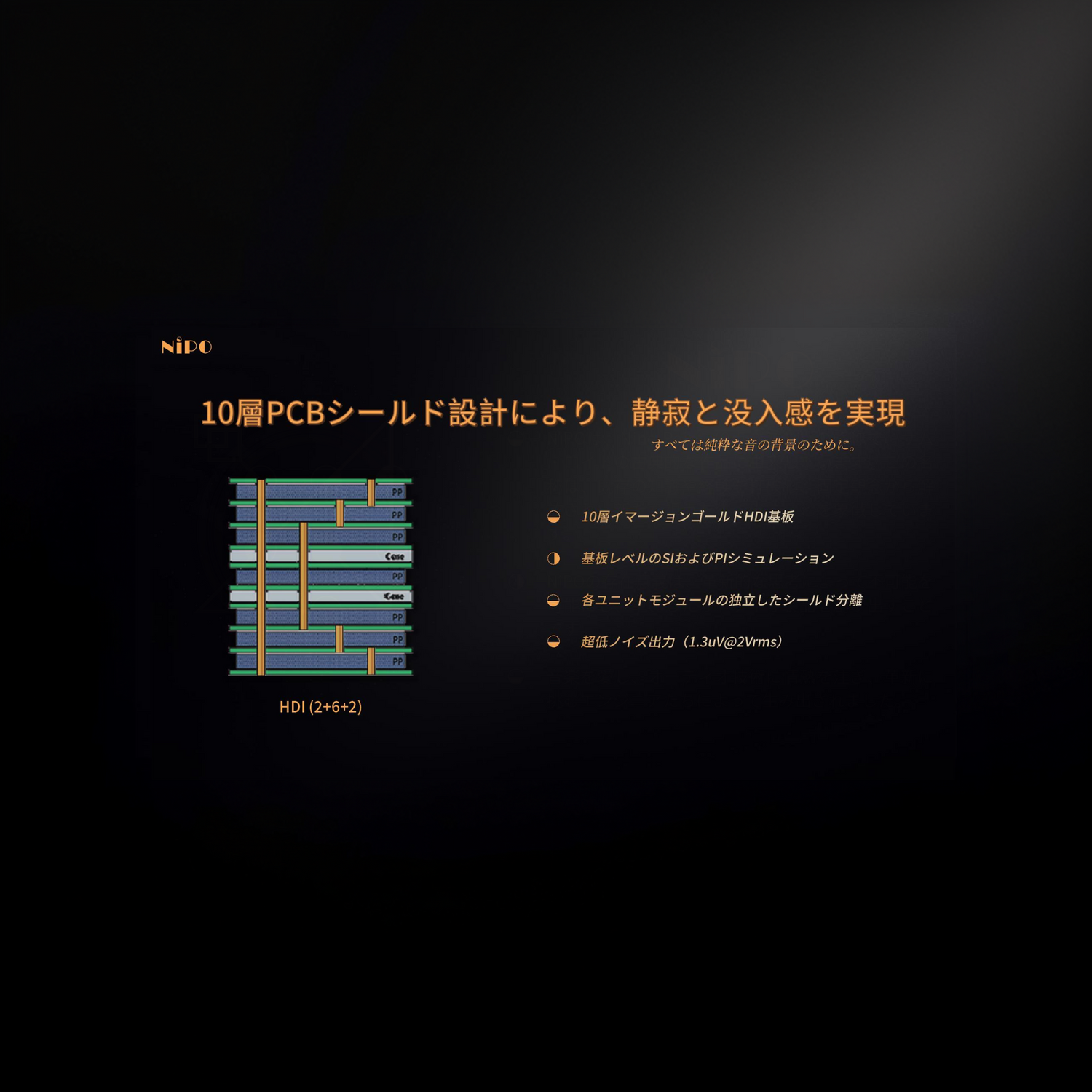 10層HDI技術を活用したPCBシールド設計及び全ディスクリートアナログ回路により、音質の基盤となるノイズ抑制性能と信号安定性を飛躍的に向上させました。