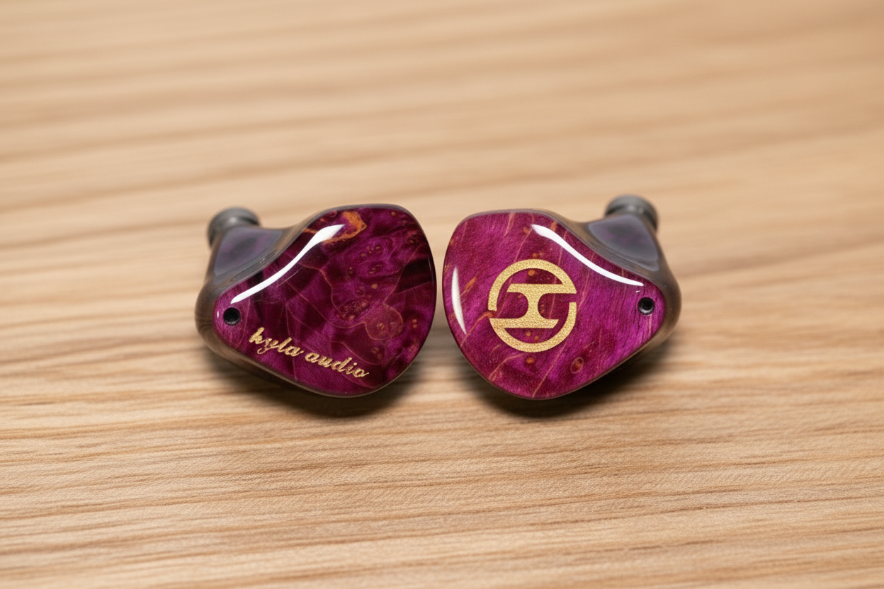 半透明な樹脂筐体と色味をあわせるため、自然な環境再現をモチーフにしたウッドプレートを採用しました。特別な紫色を含浸させており、木目模様はそれぞれ違う表情を見せるため自分だけの特別なモデルとなります。また、含浸処理をおこなう事で余分な響きや共振を抑えています。